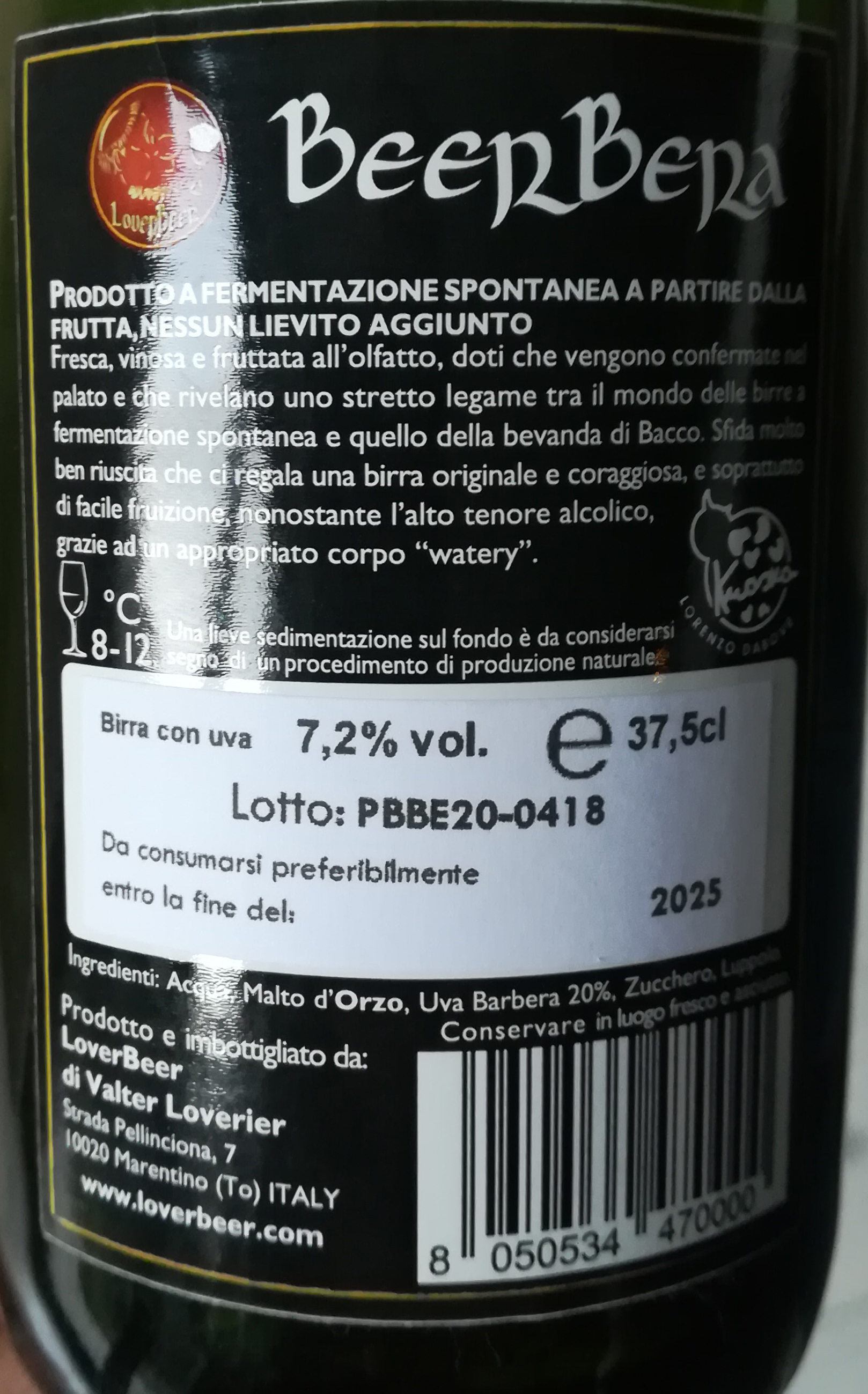 BeerBera è la prima birra prodotto da Valter Loverier di LoverBeer, una birra che ha mosso i primi passi nel 2003, dovendo attendere qualche anno prima di entrare nel mondo delle birre artigianali vere e proprie, non casalinghe. Valter ci ha spiegato come la fermentazione non venga fatta attraverso l’inoculazione di lieviti, bensì direttamente dalla componente di mosto di uva Barbera che viene aggiunta al mosto di birra. Le uve sono il 20% del prodotto iniziale, mosto che poi va inserito in botte e ci rimane per qualche tempo. Questa BeerBera è con tutta probabilità il prodotto iconico di Valter.